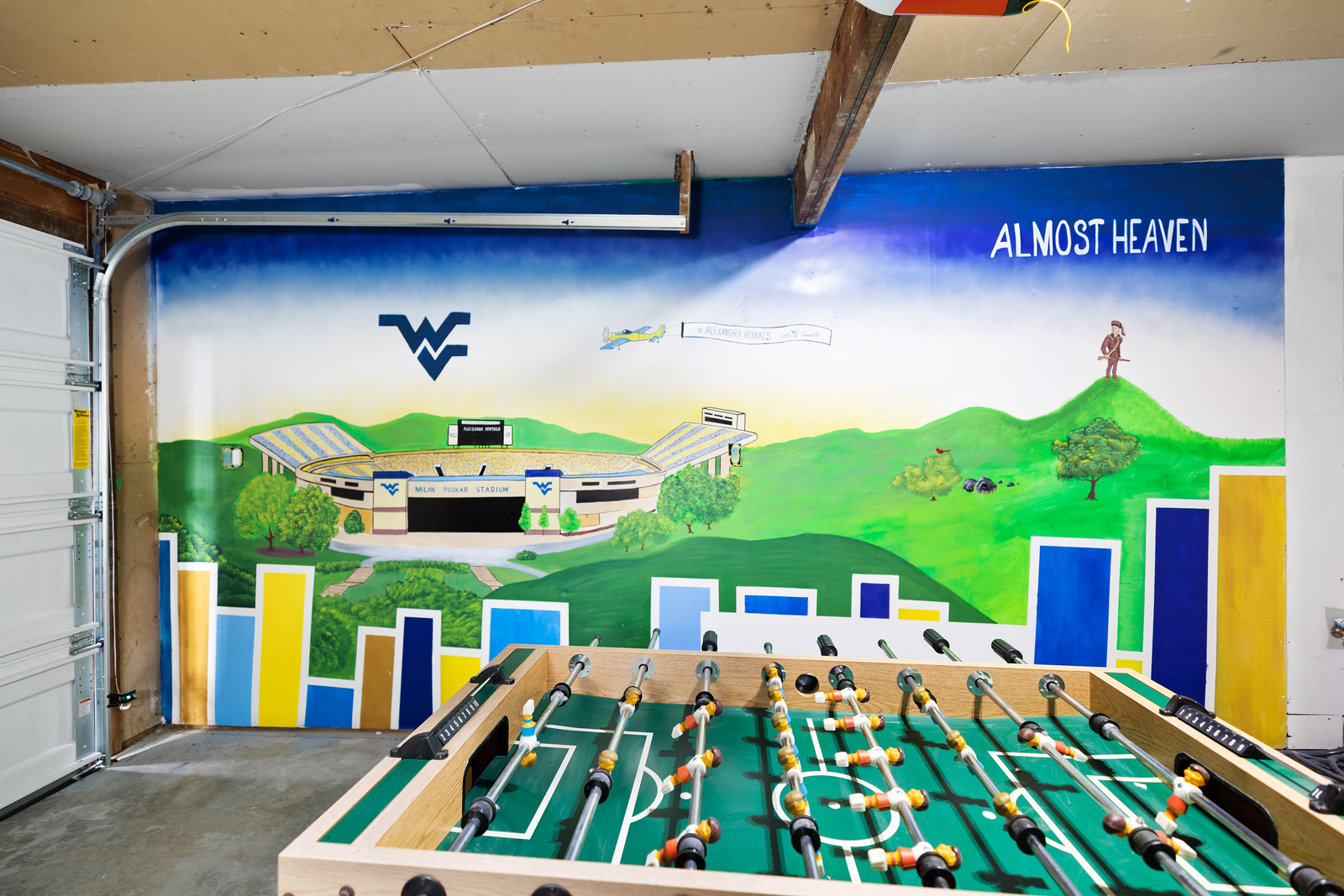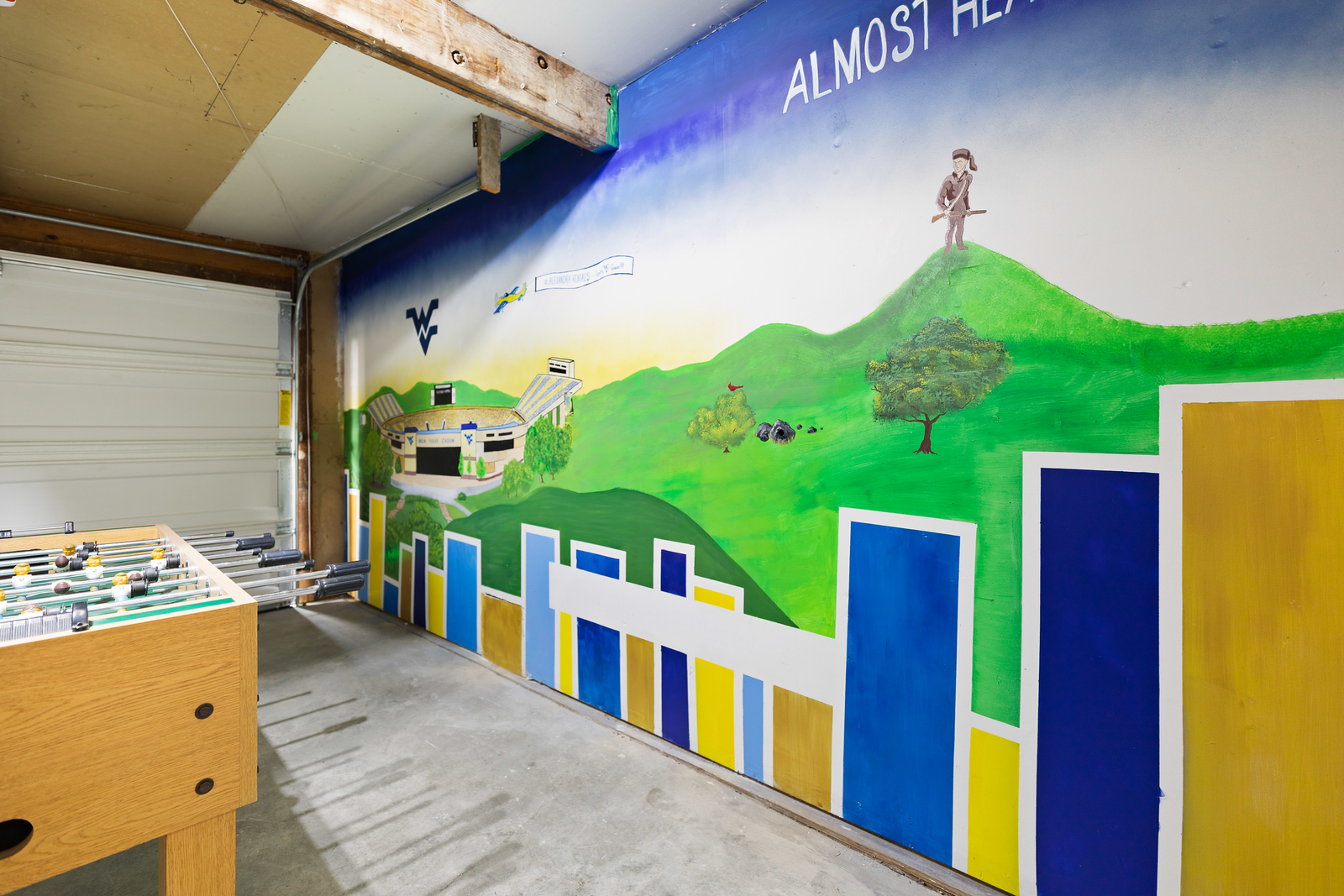 The Modern Mountaineer sits on 2 floors, has air conditioning and heat throughout, full kitchen with a gorgeous spacious island with seating for 4 at the bar, open to a dining area with a table that seats 4, as well. There is a laundry area, with washer and dryer and a half-bath on the main floor. Another cool feature that makes this space unique is the garage, it houses a foosball table and has a custom-painted wall mural of all things Mountaineer, done by a local artist. The stairs lead to 2 bedrooms and 2 full bathrooms, one King suite and one Queen. Both have their own bathrooms en suite and each bedroom has a designated work area with a desk and chair. Each bedroom and the living room are all equipped with smart TV’s. Extra pillows and blankets are provided to make every stay as cozy and comfy as possible.