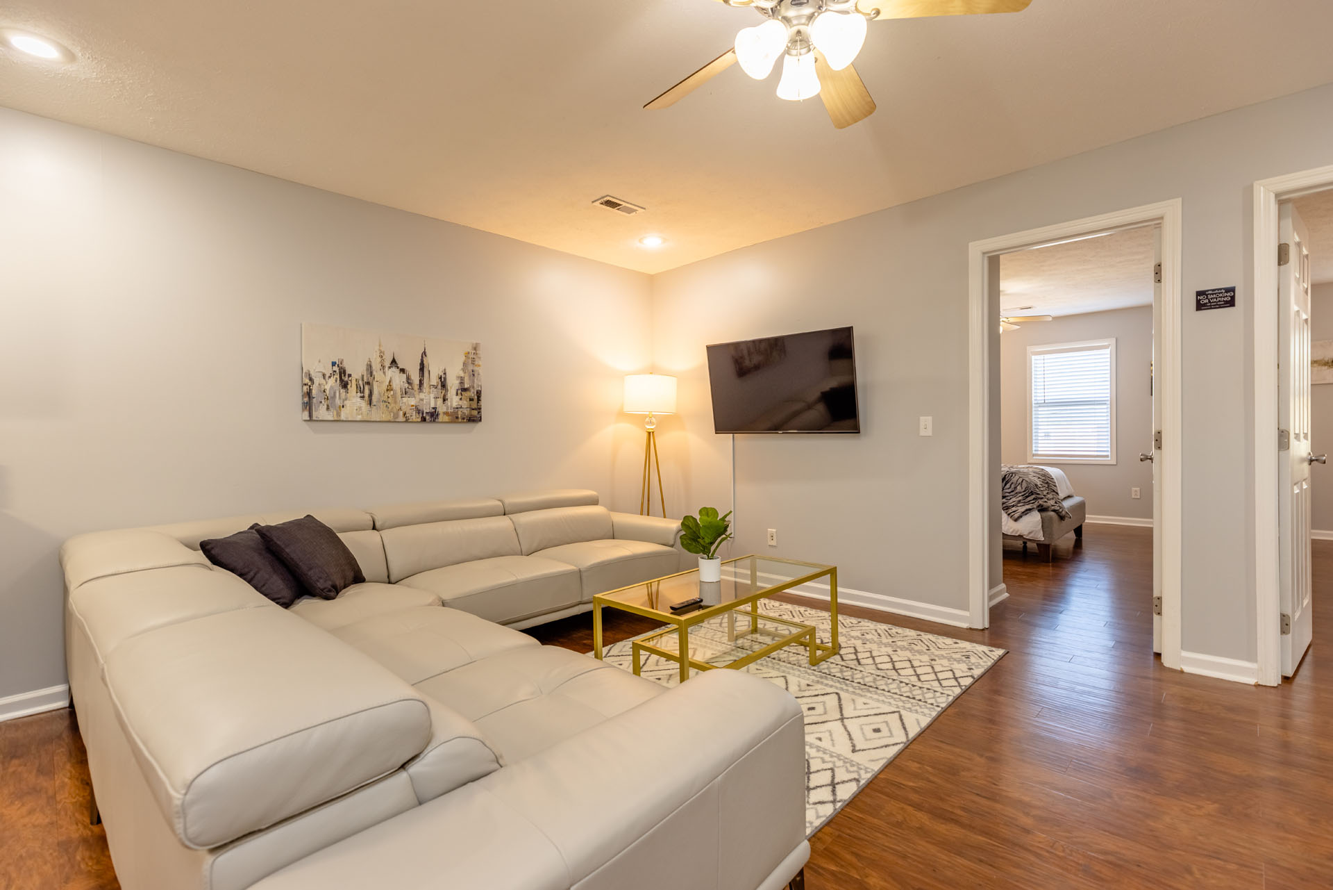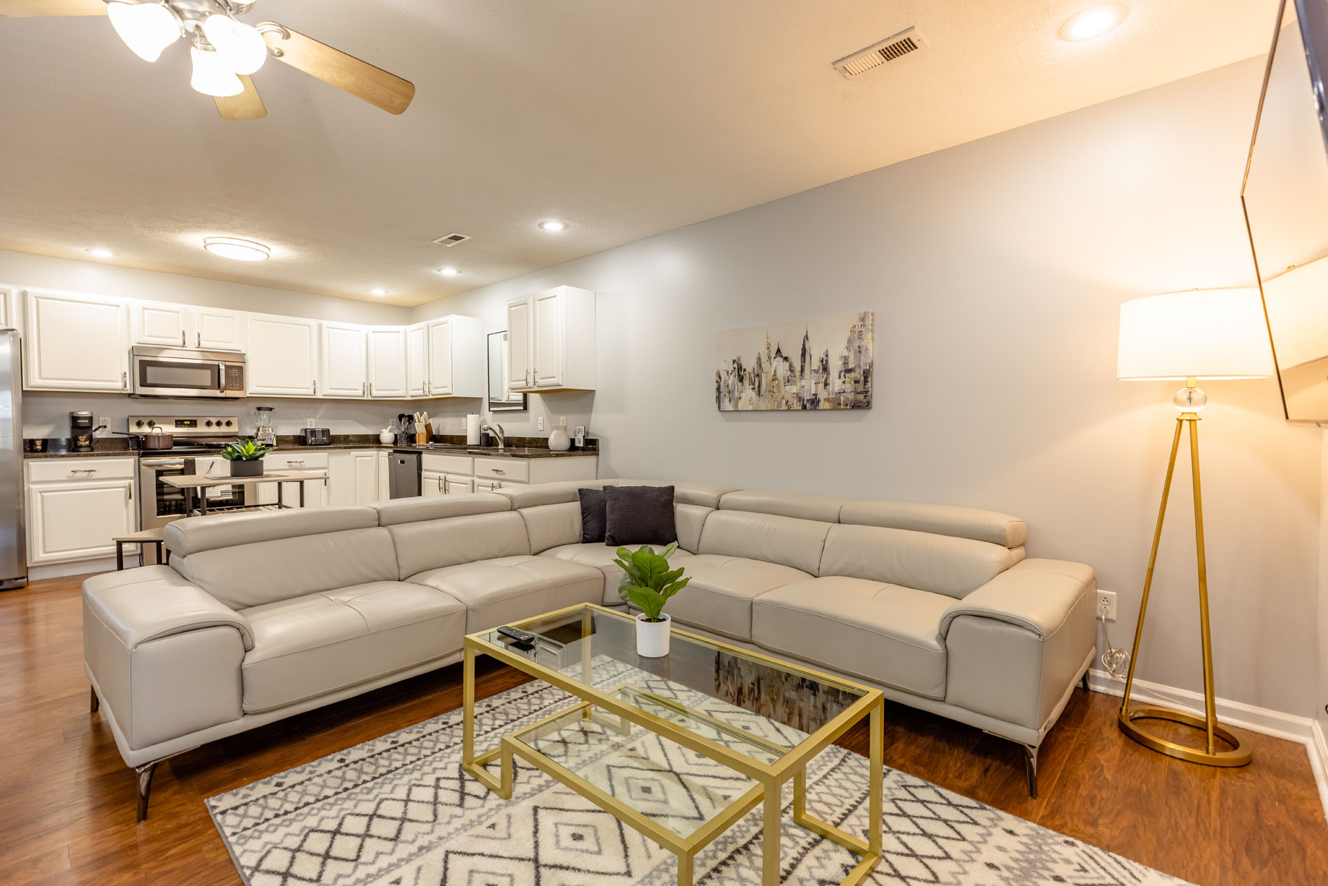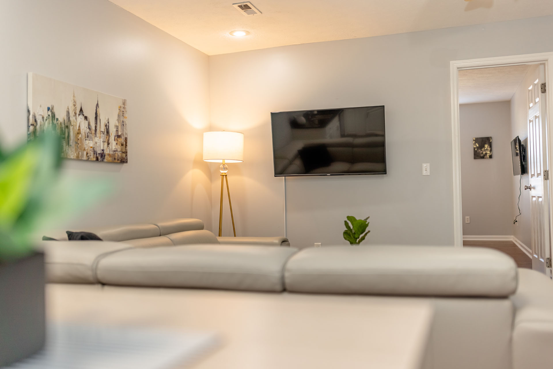 For our business travelers, or just those who like a space to check emails or shop online, we include a modern, adjustable desk to ensure a comfortable and productive workspace. Large, modern sectional sofa and smart TV in the living room create a comfortable place to kick back after a day at the game or checking out all the local flair in the area. No matter what brings you to Morgantown, this space will welcome you home at the end of the day.